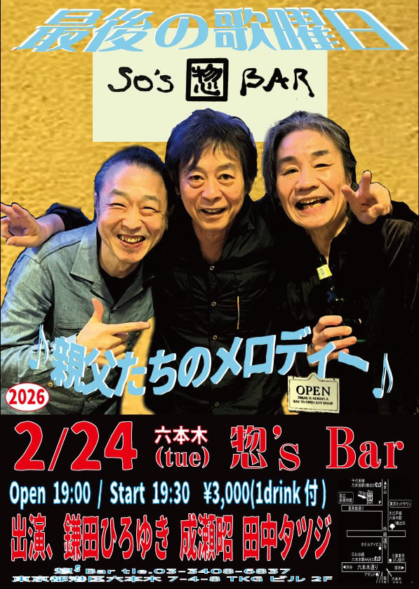 | ★2/24(火) 六本木 惣's BAR 『最後の歌曜日』 act 鎌田ひろゆき、田中タツジ、成瀬昭 open 19:00 / start 19:30 charge ¥3,000(1D付き) 【惣's BAR】 03-3408-6837 港区六本木7-4-8 TKGビル ![]() ー 終了、ありがとうございました!ー 01. エレベーター 02. 今を見てる 03. 30年前の時代 04. 音楽を流す 05. La-La-Be 06. 夜明け前が一番暗い 07. 春が来た 08. ハレルヤ! アンコールセッション 01. デイ・ドリーム・ビリーバー(忌野清志郎カヴァー with 鎌田ひろゆき、田中タツジ) |