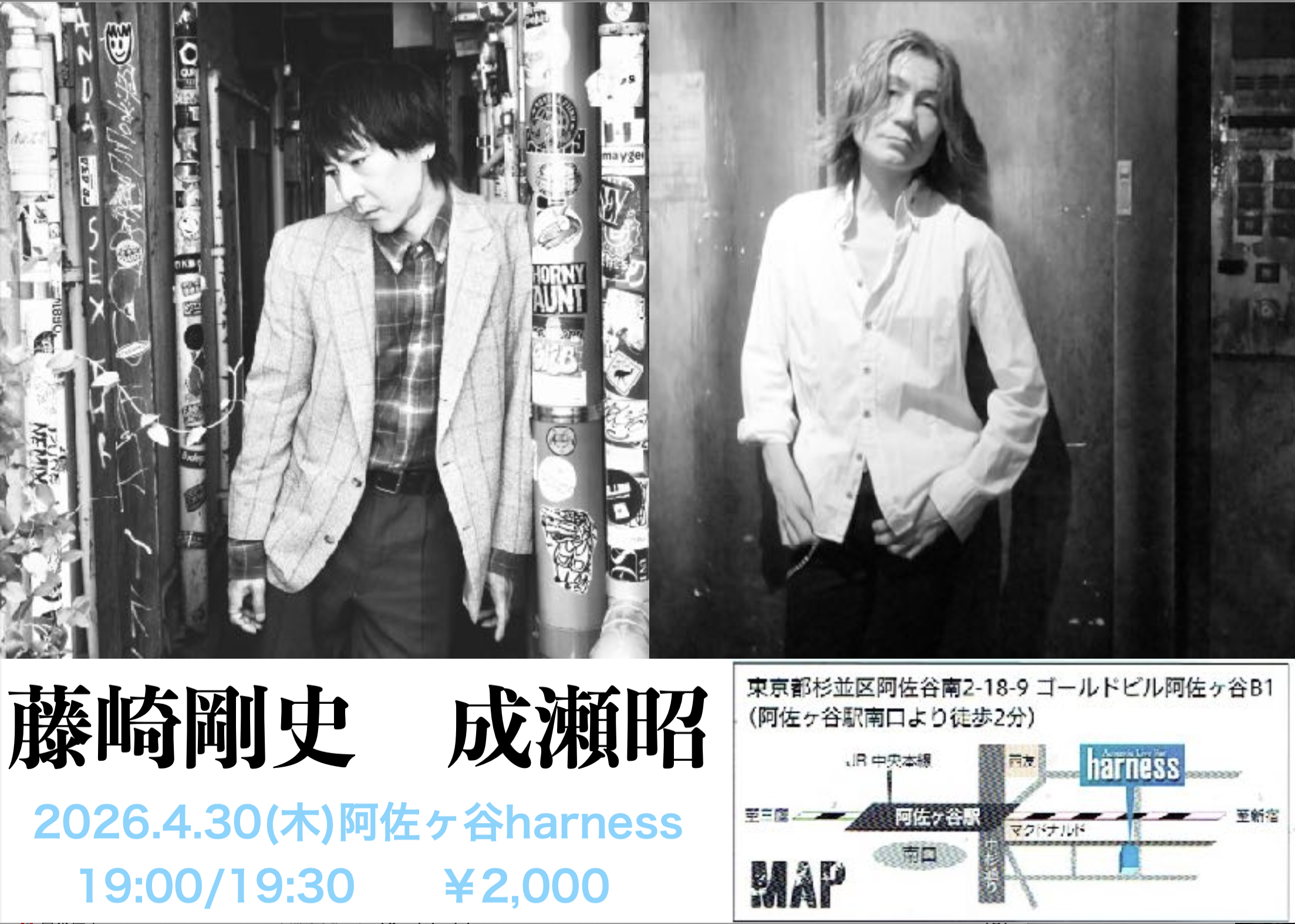 | ★4/30(木) 阿佐ヶ谷 harness act 藤崎剛史、成瀬昭 open 19:00 / start 19:30 charge ¥2,000+オーダー 【harness】 03-6454-6277 杉並区阿佐谷南2-18-9 ゴールドビル阿佐ヶ谷B1F ![]() |