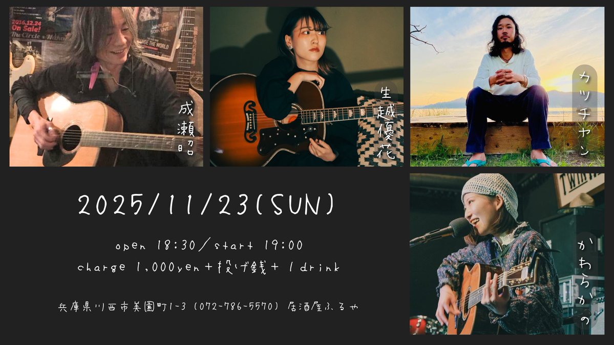 | ★11/23(日) 兵庫川西 居酒屋ふるや act 生越優花、かわらかの、カッチャン、成瀬昭 open 18:30 / start 19:00 charge ¥1,000+投げ銭 【居酒屋ふるや】 072-786-5570 兵庫県川西市美園町1-3 川西宝泉ビル1 ![]() |