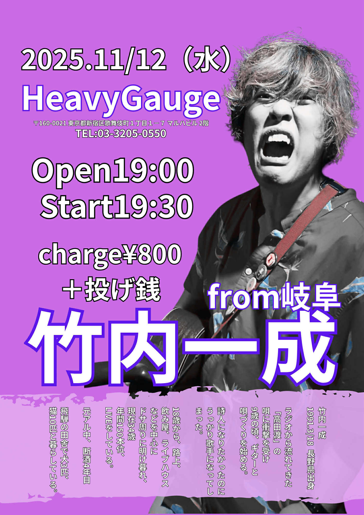 | ★11/12(水) act 竹内一成(from 岐阜) open/start 19:00/19:30 charge 投げ銭+通常営業料金(テーブルチャージ¥800) ![]() |